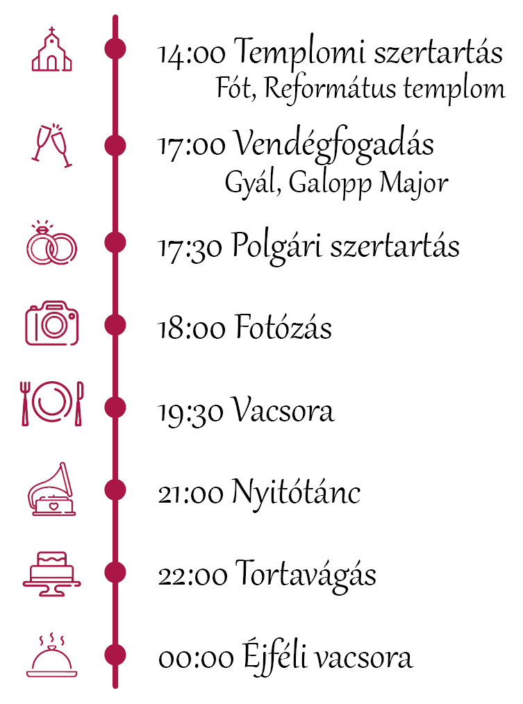 Alkalomhoz illő és az időjárásnak meglelelő elegáns öltözetet. A polgári szertartás és vacsora helyszíne főleg füves területen lesz, így a hölgyeknek érdemes megfelelő cipővel készülni. Illetve szeretnénk kérni, hogy erre az egy napra a fehér, piros és bordó színeket hagyjátok meg a menyasszony és a koszorúslányok részére.